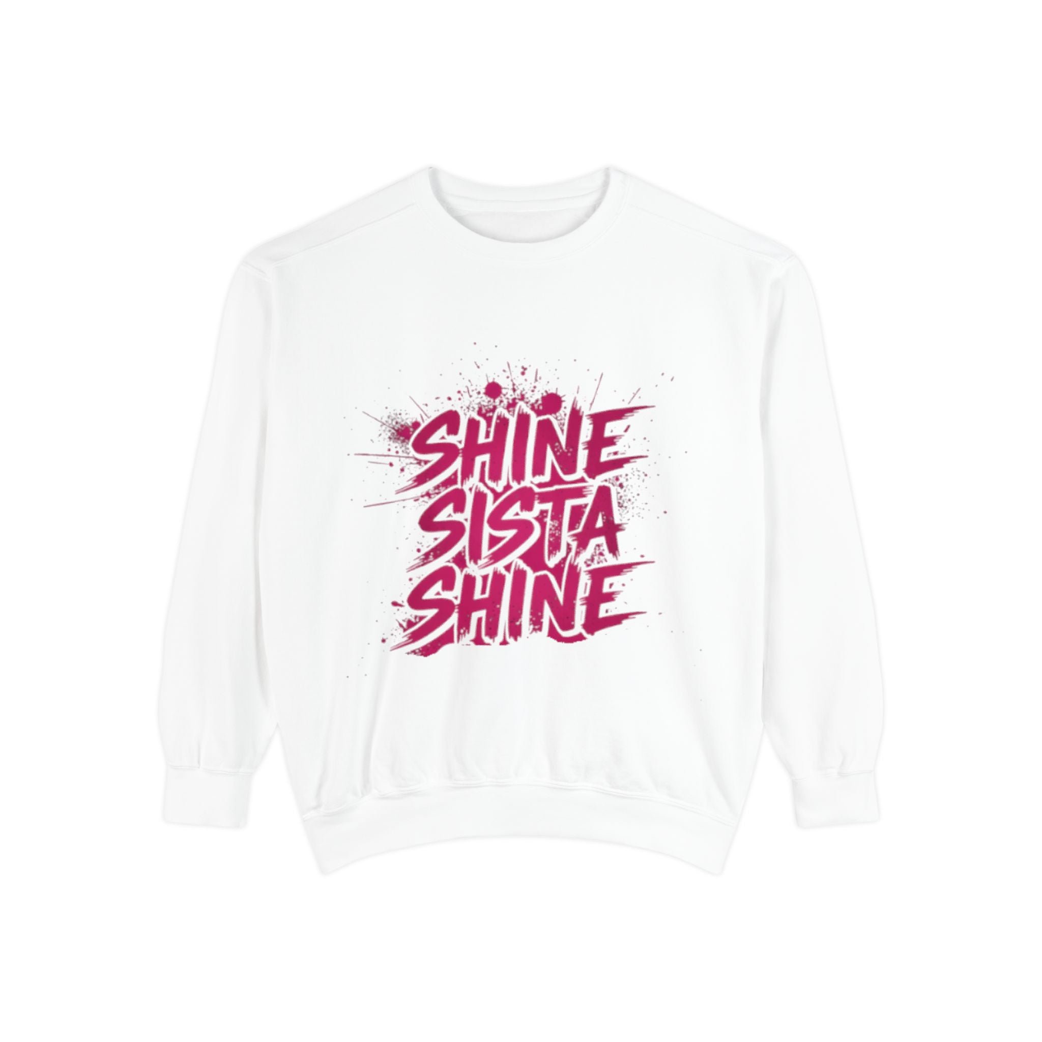 This relaxed-fit garment-dyed sweatshirt celebrates bold sisterhood with an energetic, hand-painted graphic that reads “Shine Sista Shine.” The medium-heavy 80/20 ring-spun cotton-poly fabric feels soft and slightly luxe against the skin while holding print and embroidery detail beautifully. Thoughtful construction — ribbed collar, cuffs and hem, twill neck tape and a half-moon back patch — keeps the silhouette comfortable and resilient through repeated wear. Wear it as a cozy layer for chilly mornings, as a statement piece at community events, or while cheering on friends — it’s made to move with you and keep its shape. OEKO-TEX low-impact dyes and a sewn-in twill label finish the piece with conscientious details.